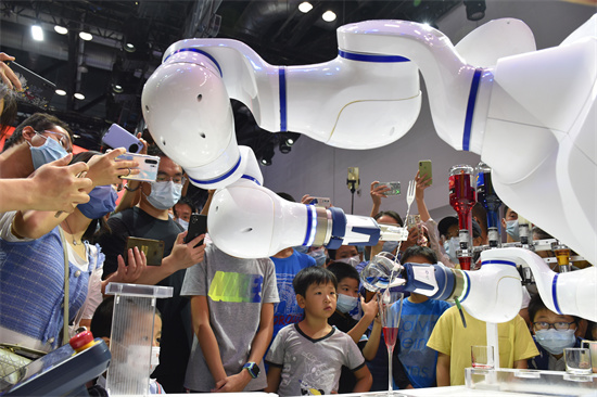 9月4日,在北京國家會議中心中國服務(wù)貿(mào)易成就展專區(qū),雙臂協(xié)作式機(jī)器人化身“調(diào)酒師”現(xiàn)場調(diào)酒。