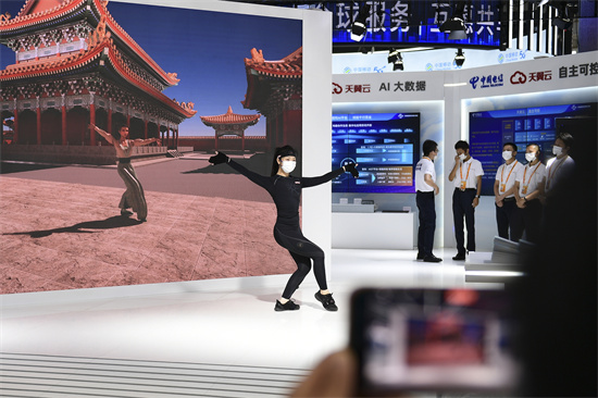 9月1日,參觀者在服貿(mào)會首鋼園展區(qū)拍攝由真人控制的虛擬數(shù)字人表演。