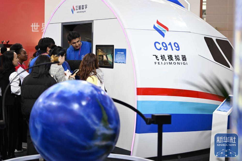 ↑ 11月21日,參會(huì)者在職業(yè)教育專題展上參觀C919飛機(jī)模擬器。新華社記者 李然 攝