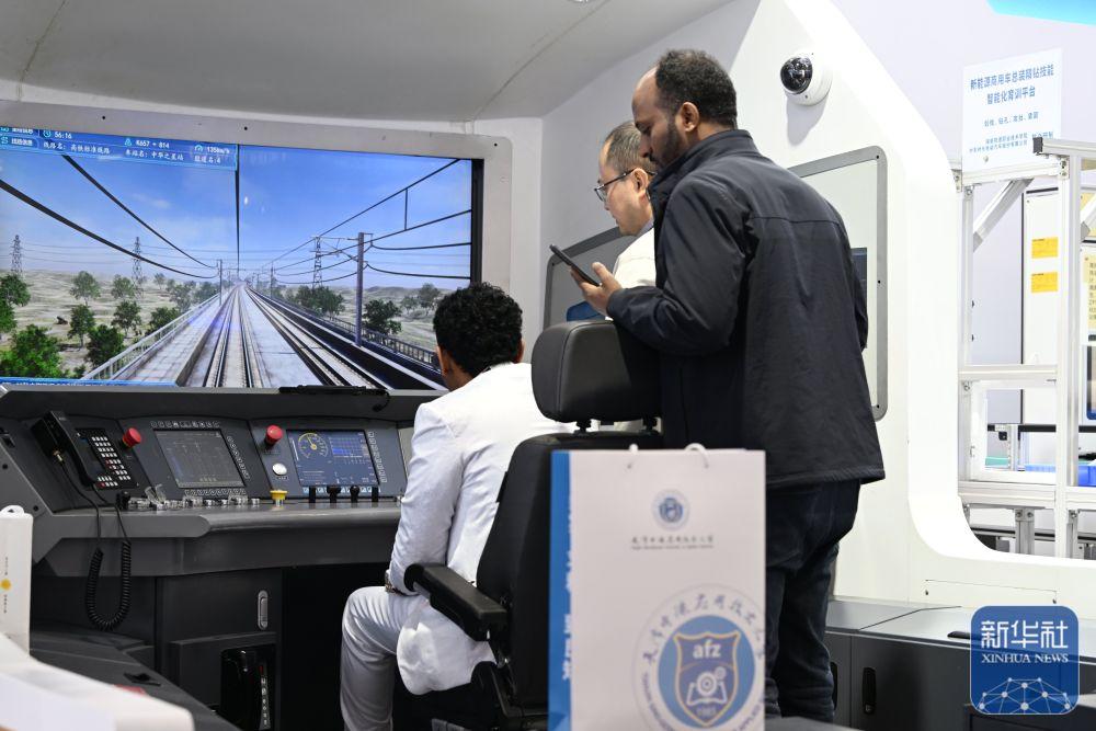 ↑ 11月21日,參會(huì)者在職業(yè)教育專題展上體驗(yàn)高鐵模擬器。新華社記者 李然 攝
