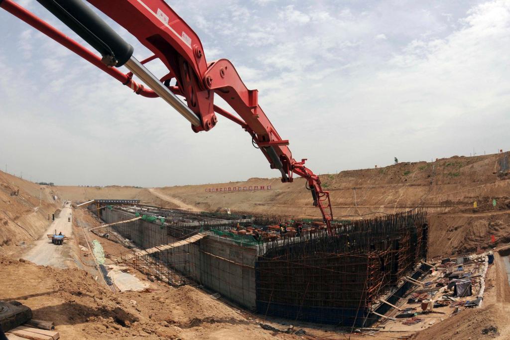 2010年5月18日,河南黃河建工集團(tuán)施工人員在南水北調(diào)中線工程沁河倒虹吸施工現(xiàn)場澆筑廂形預(yù)應(yīng)力鋼筋混凝土管身。新華社發(fā)(楊帆 攝)