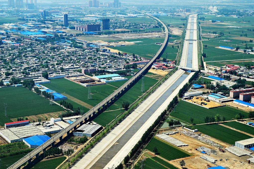 2014年5月12日,南水北調(diào)中線總干渠石家莊段(右)與京石高鐵“并肩而行”。新華社記者 楊世堯 攝