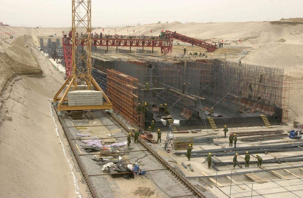 2004年4月2日,工人在南水北調(diào)滹沱河倒虹吸工程工地現(xiàn)場施工。新華社記者 楊世堯 攝
