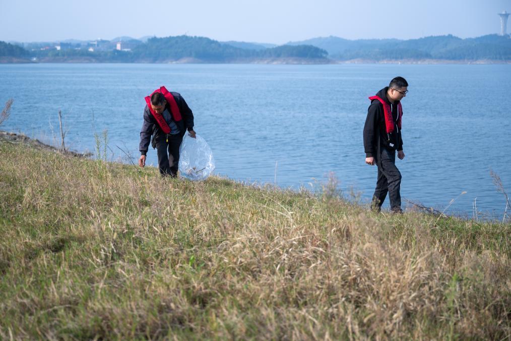 2024年10月25日,清漂隊(duì)隊(duì)員在丹江口水庫一個(gè)小島上清理垃圾。新華社記者 杜子璇 攝