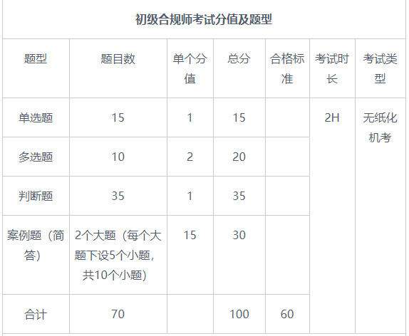 初級(jí)企業(yè)合規(guī)師考試,滿分100分,60分及格;