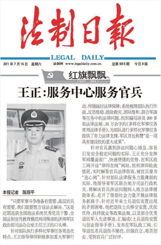 最初我只是《法制日報》的一名忠實讀者,沒想到后來成為她宣傳的對象。記得是2011年7月,恰逢建黨90周年,各大媒體相關宣傳如火如荼。當時,我先后被中宣部、司法部表彰為全國法制宣傳教育模范,被中央政法委表彰為全國政法系統(tǒng)優(yōu)秀黨員干警,首次走入人民大會堂接受頒獎。當我還處在頒獎的興奮中時,突然接到軍區(qū)政治部新聞干事的電話,說是《法制日報》要從1000名受表彰的個人中選取20人重點宣傳,報社記者陳麗平要采訪我。不久,《王正:服務中心服務官兵》一文在《法制日報》慶祝建黨90周年“紅旗飄飄”欄目登出。有幸成為20位代表之一,無形中放大了我的工作成果和影響,確實倍感鼓舞和激勵,為我后來成長為濟南軍區(qū)“愛崗敬業(yè)”機關干部典型寫下注腳。