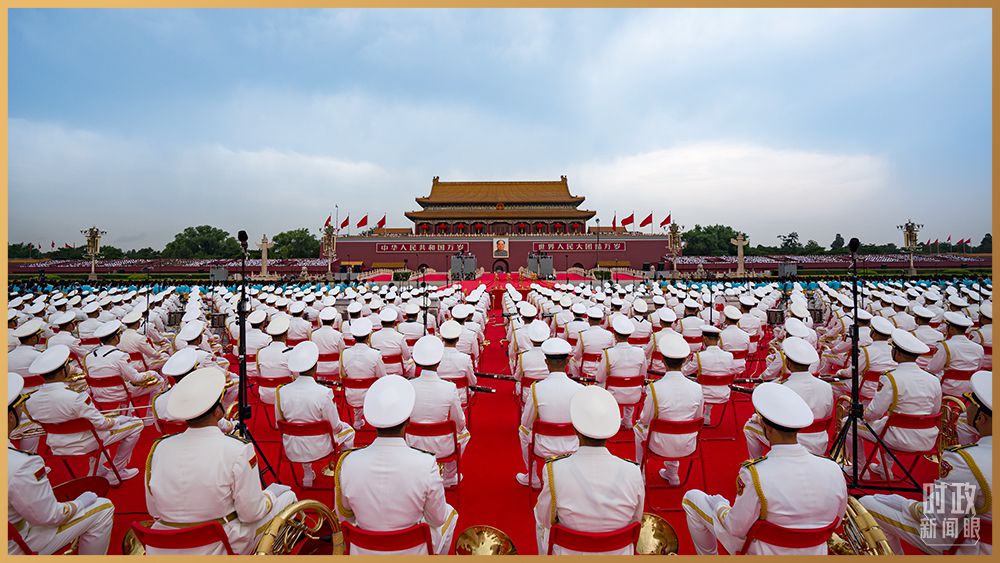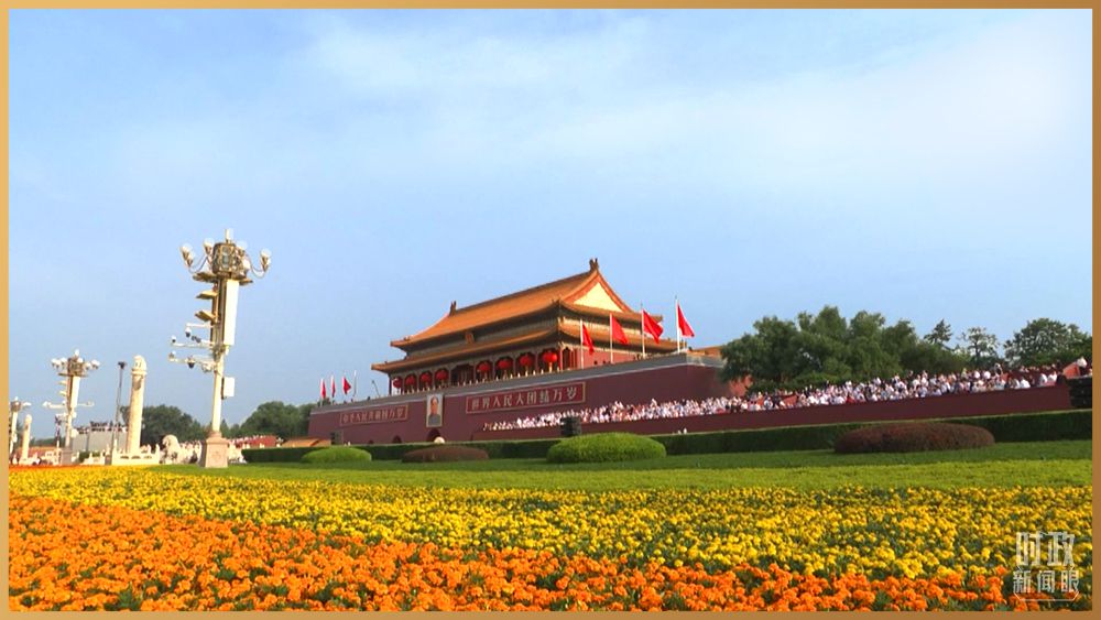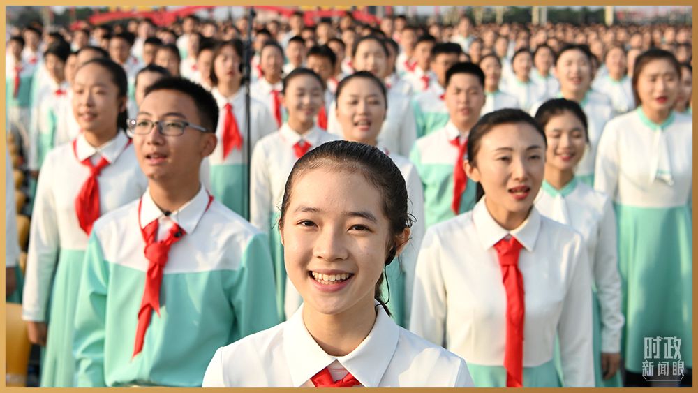 8點整,慶祝大會開始。100響禮炮響徹云霄。現(xiàn)場升國旗、奏唱國歌。此后,各民主黨派、工商聯(lián)和無黨派人士聯(lián)合致賀詞,由共青團員和少先隊員組成的千人方陣集體致獻詞。