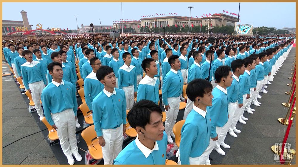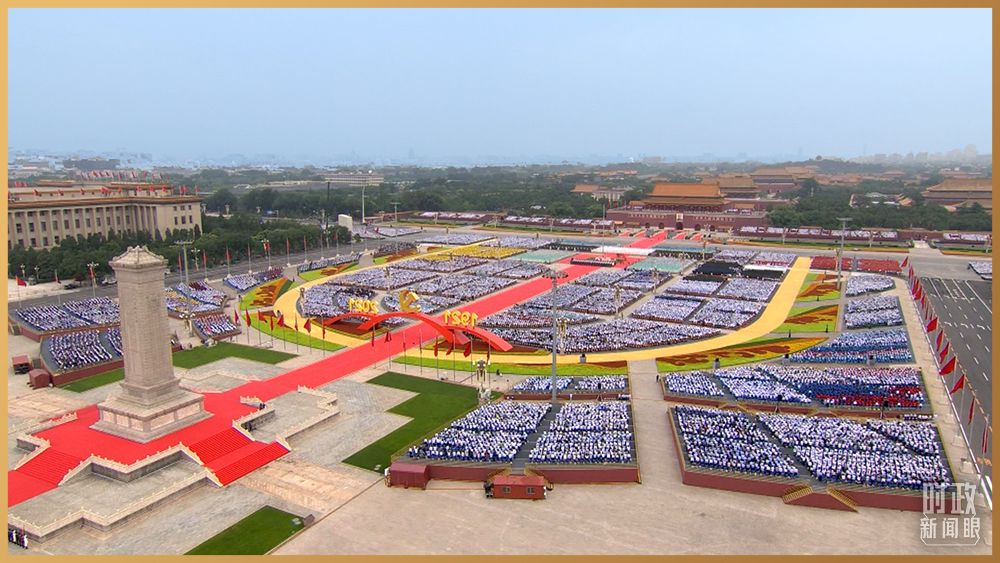 建黨百年的慶祝大會,盛大而隆重。從空中俯瞰,天安門廣場呈現(xiàn)“巨輪啟航”的造型,巨輪的前甲板一直延伸到人民英雄紀念碑,高7.1米、寬7.1米的黨徽在船弦上高高挺立,巨輪兩側(cè)100面紅旗迎風(fēng)招展。