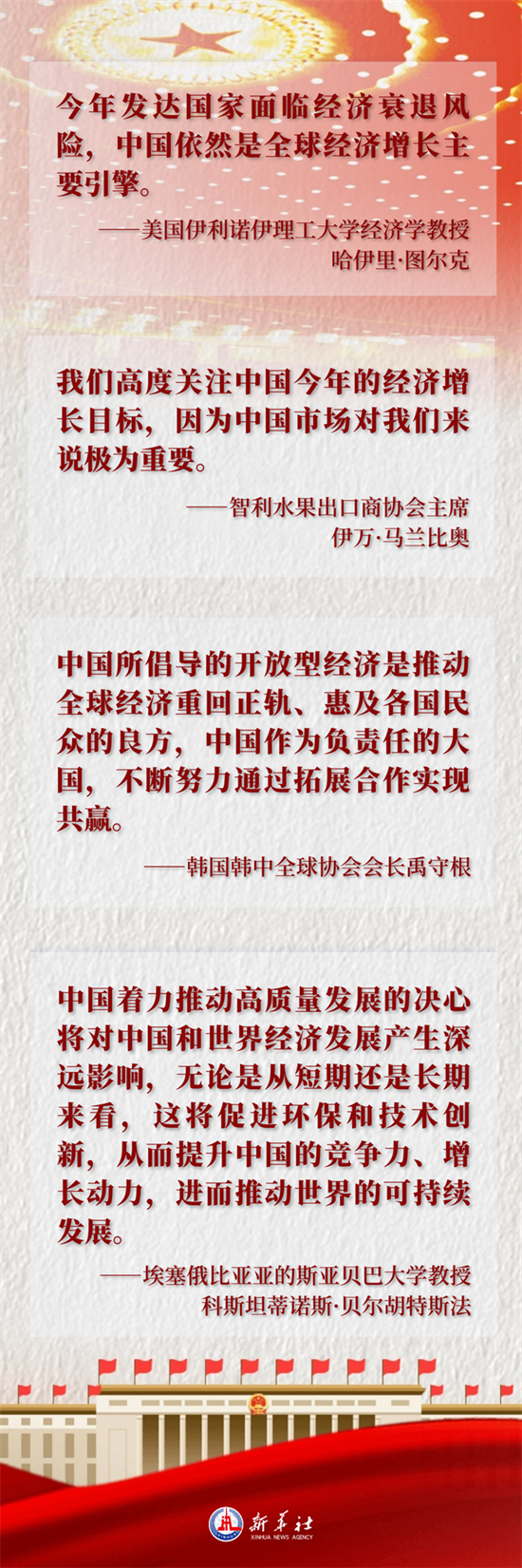 從國內生產總值增長目標,到更大力度吸引和利用外資宣示,從加快建設現(xiàn)代化產業(yè)體系,到推動發(fā)展方式綠色轉型,在中國全面貫徹黨的二十大精神的開局之年,國際社會從兩會讀出新征程上中國高質量發(fā)展的舉措與步伐,讀出中國發(fā)展傳遞給全球的信心、暖意和動力。