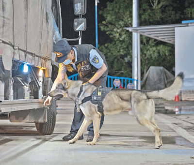 西雙版納邊境管理支隊(duì)大開河邊境檢查站移民管理警察攜帶警犬查驗(yàn)貨車。曾玉祥 畢小懿攝影報(bào)道