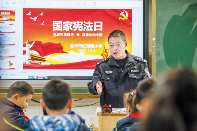 2023年12月4日是第十個(gè)國(guó)家憲法日。當(dāng)天,金華市各地開展形式多樣的憲法普法教育宣傳活動(dòng),普及憲法知識(shí),弘揚(yáng)憲法精神,增強(qiáng)全民憲法意識(shí)。圖為金華市婺城區(qū)紅湖路小學(xué)教室里,該校法制副校長(zhǎng)金忠清給學(xué)生講解憲法知識(shí)。
