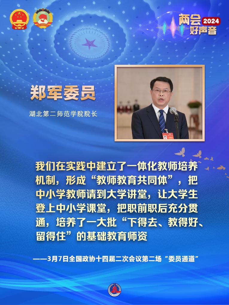 “我們?cè)趯?shí)踐中建立了一體化教師培養(yǎng)機(jī)制,形成‘教師教育共同體’,把中小學(xué)教師請(qǐng)到大學(xué)講堂,讓大學(xué)生登上中小學(xué)課堂,把職前職后充分貫通,培養(yǎng)了一大批‘下得去、教得好、留得住’的基礎(chǔ)教育師資?!焙钡诙煼秾W(xué)院院長(zhǎng)鄭軍委員說。