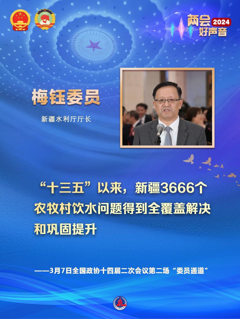 新疆是典型的內(nèi)陸干旱地區(qū),新疆水利廳廳長(zhǎng)梅鈺委員講述了新疆做好“水文章”的兩個(gè)小故事,帶來了新疆人民喝上“放心水”“幸福水”、新疆高效合理科學(xué)利用水資源的好消息。