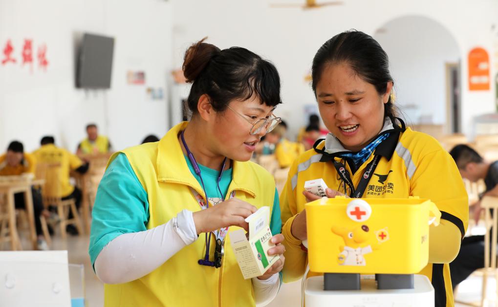 在山東省臨沂市郯城縣郯城街道龍泉社區(qū)“小哥食堂”,外賣騎手在便民藥箱內(nèi)取用防暑藥品(2022年7月9日攝)。新華社發(fā)(張春雷 攝)