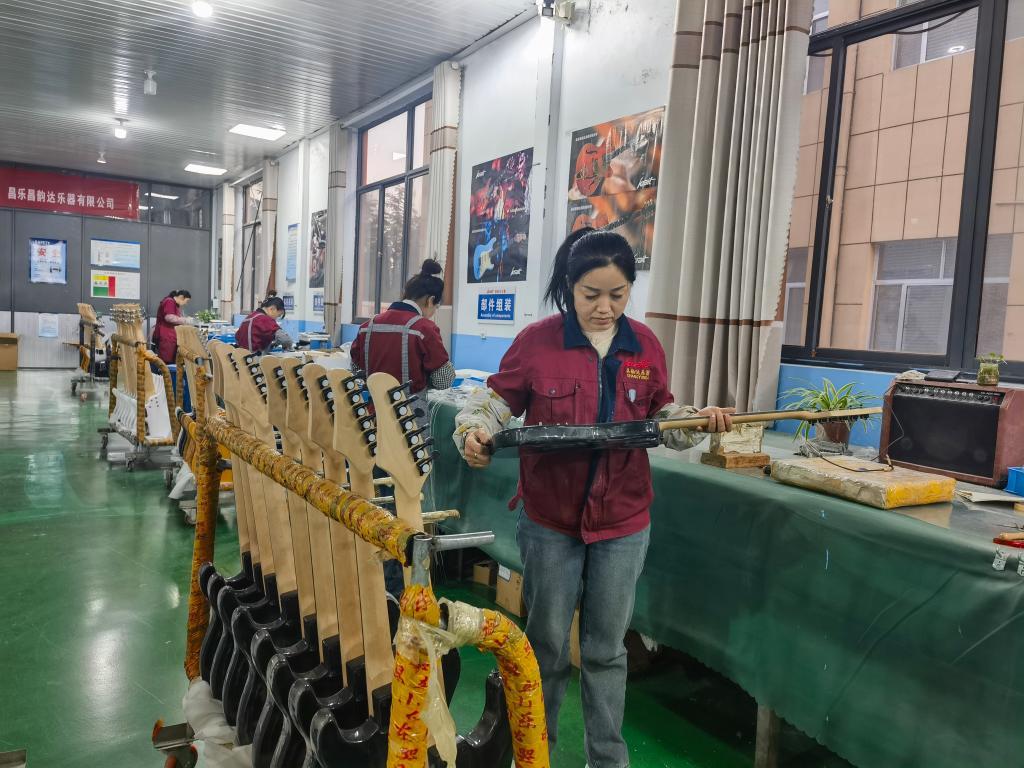 今天的鄌郚鎮(zhèn),總?cè)丝诓贿^8萬,卻有5000多人從事樂器產(chǎn)業(yè),年人均工資收入8萬元左右。電吉他等樂器生產(chǎn)成為當?shù)鼐用褡钪匾氖杖雭碓础?/p>