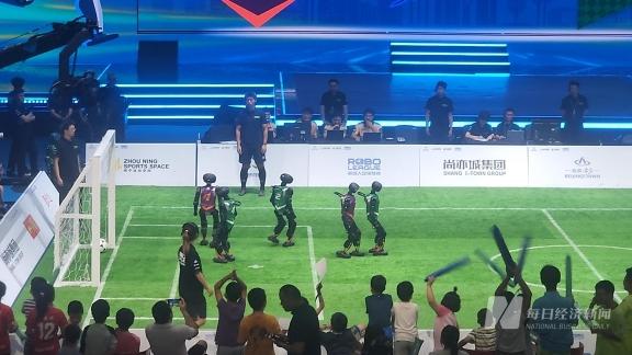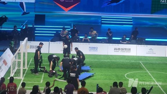 機器人“球員”進球姿勢各異,抬“傷員”的擔(dān)架成“全場最忙”