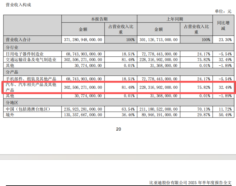 2025年上半年,比亞迪的汽車、汽車相關產(chǎn)品及其他產(chǎn)品(以下簡稱汽車業(yè)務)收入,僅比上汽集團的總營業(yè)收入多出29.18億元。