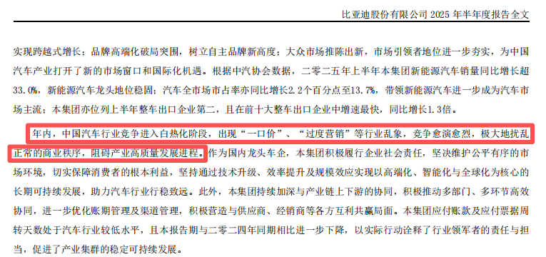 比亞迪在2025年半年報中表示,2025年上半年,中國汽車行業(yè)出現(xiàn)“一口價”“過度營銷”等行業(yè)亂象,極大地擾亂了正常的商業(yè)秩序,阻礙汽車產(chǎn)業(yè)高質(zhì)量發(fā)展進程。