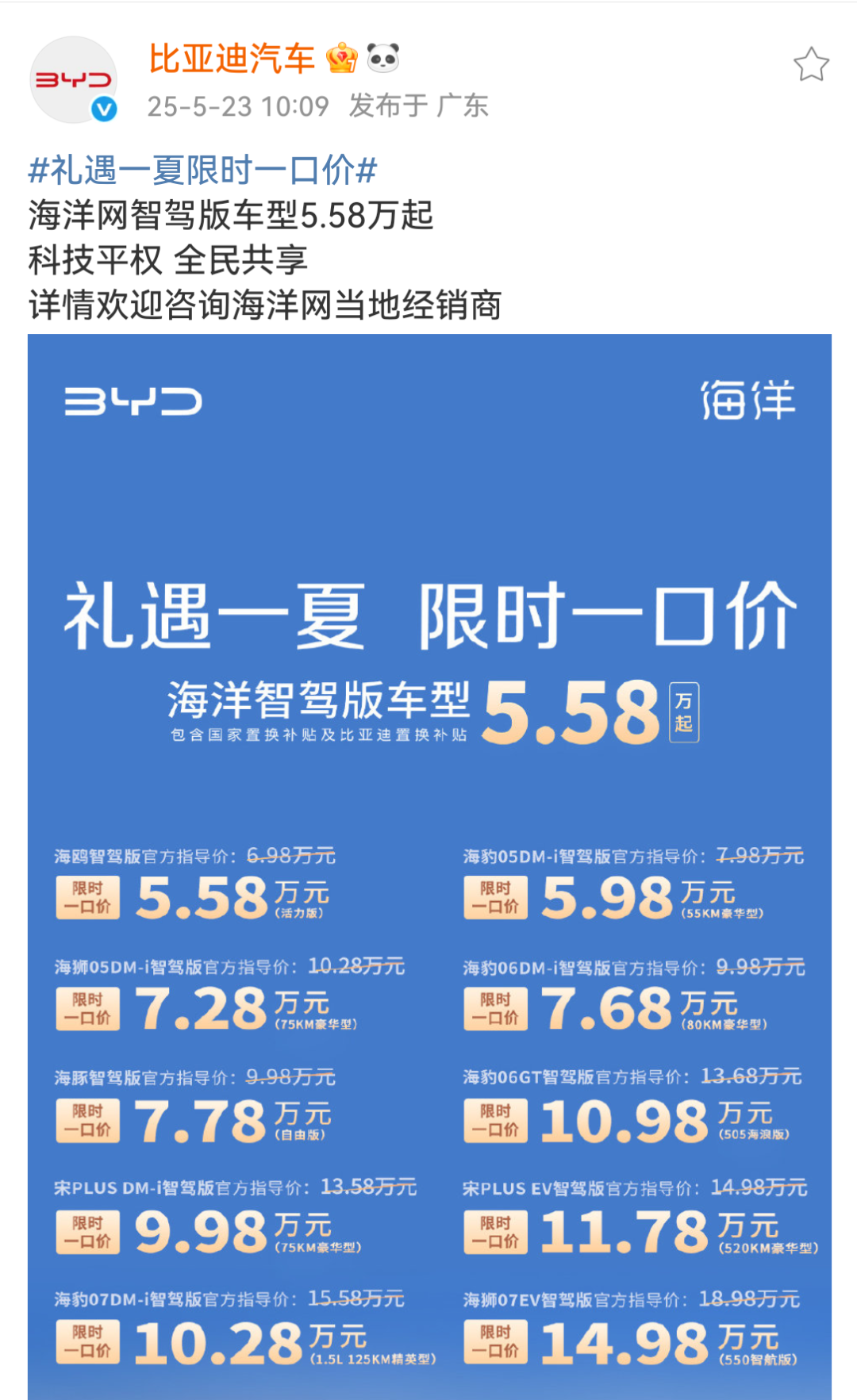比如,2025年5月下旬,比亞迪宣布推出“限時一口價”或限時補貼的促銷舉措,其中海洋網(wǎng)10款智駕版車型的“限時一口價”最低5.58萬元起。