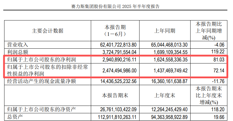 2025年上半年,賽力斯的歸母凈利潤為29.41億元,同比增長81.03%;扣非后凈利潤為24.74億元,同比增長72.14%;研發(fā)投入51.98億元,同比增長154.90%。