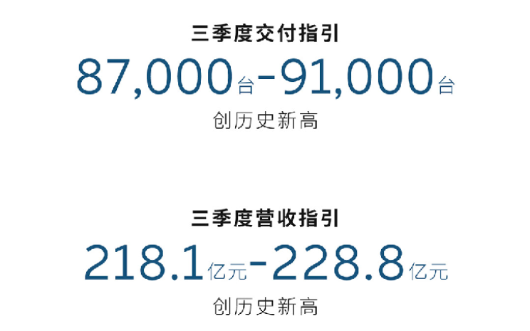 區(qū)別于其他車企,蔚來、小鵬均在發(fā)布2025年第二季度財報之際,披露了2025年第三季度的交付指引,分別是8.7萬輛至9.1萬輛、11.3萬輛至11.8萬輛。