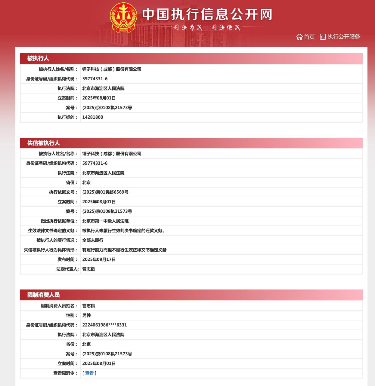 中新網(wǎng)9月18日電(吳家駒)中國執(zhí)行信息公開網(wǎng)顯示,近日,錘子科技(成都)股份有限公司,因有履行能力而拒不履行生效法律文書確定義務(wù),被列為失信被執(zhí)行人(老賴),涉及與蘇州紫輝盛網(wǎng)創(chuàng)業(yè)投資企業(yè)(有限合伙)相關(guān)借款合同糾紛案件,被執(zhí)行人的履行情況為全部未履行,執(zhí)行法院為北京市海淀區(qū)人民法院。此前,今年8月,該公司及其法定代表人管志良,已因上述案件被執(zhí)行2142萬余元,并被限制高消費(fèi)。
