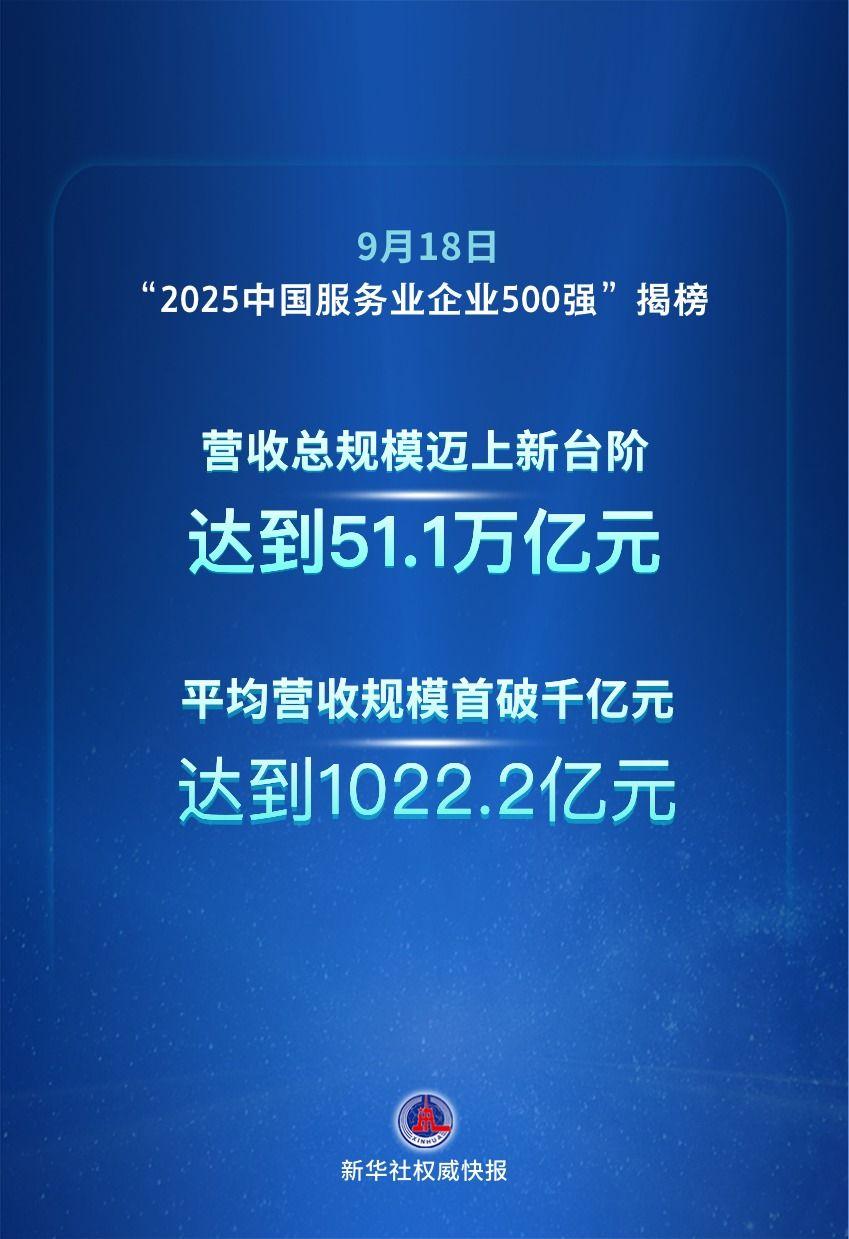 9月18日,中國企業(yè)聯(lián)合會、中國企業(yè)家協(xié)會在重慶發(fā)布“2025中國服務(wù)業(yè)企業(yè)500強(qiáng)”。入圍企業(yè)2024年營業(yè)收入總規(guī)模邁上新臺階,達(dá)到51.1萬億元,平均營業(yè)收入規(guī)模首次突破千億元大關(guān),達(dá)到1022.2億元。